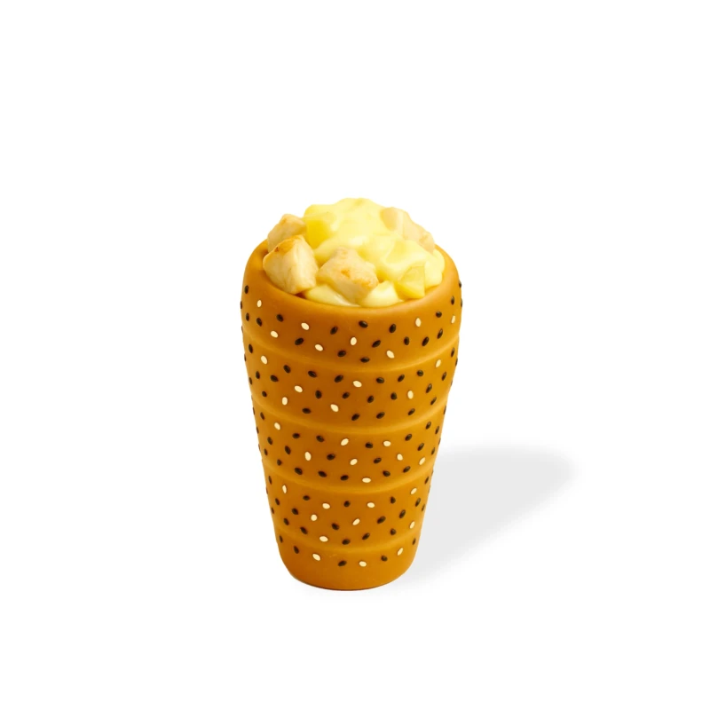 Трдельник, наполненный запечённым куриным филе, ананасом, сыром и сливочно-чесночным соусом, посыпается сверху кунжутом